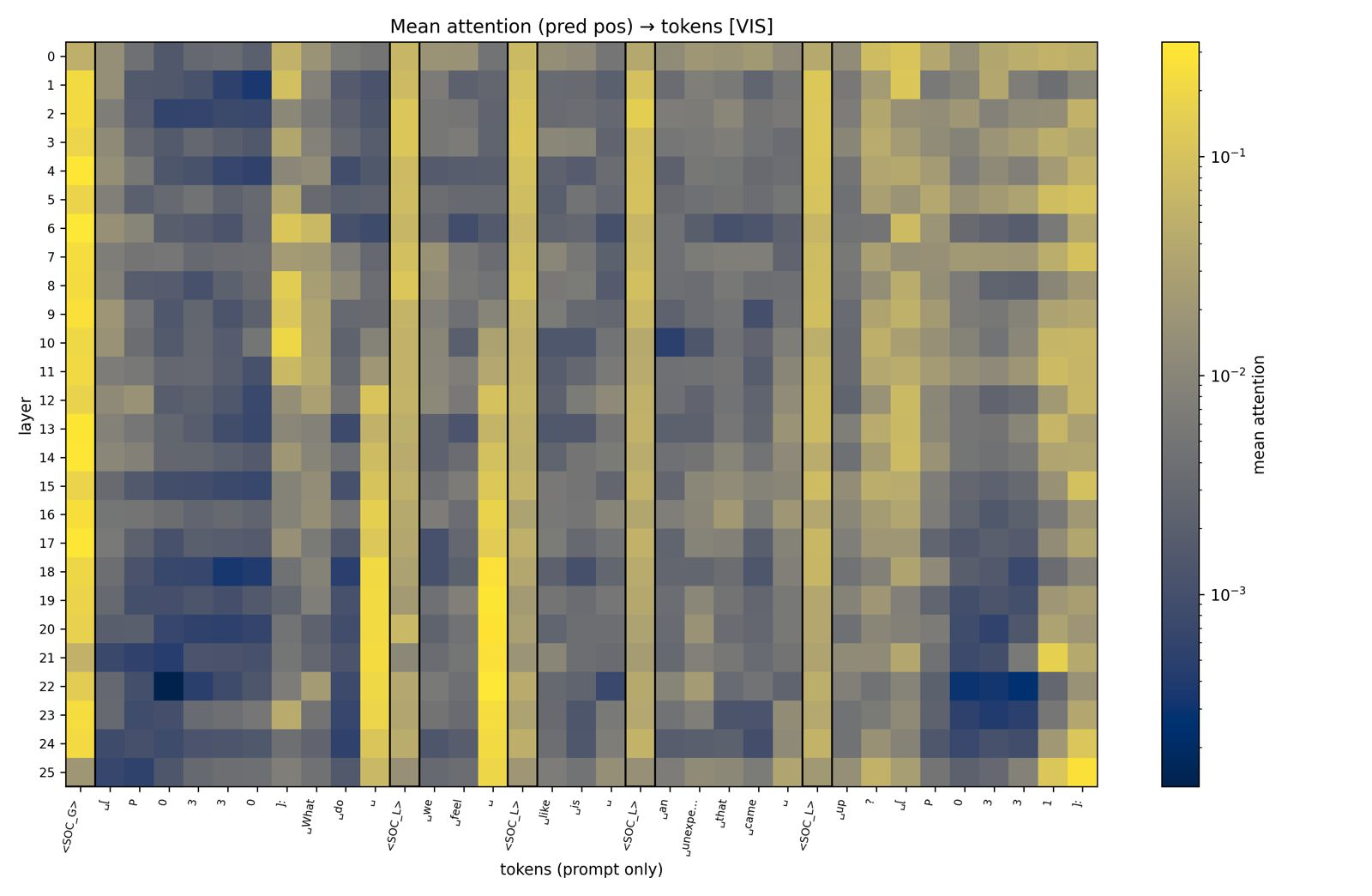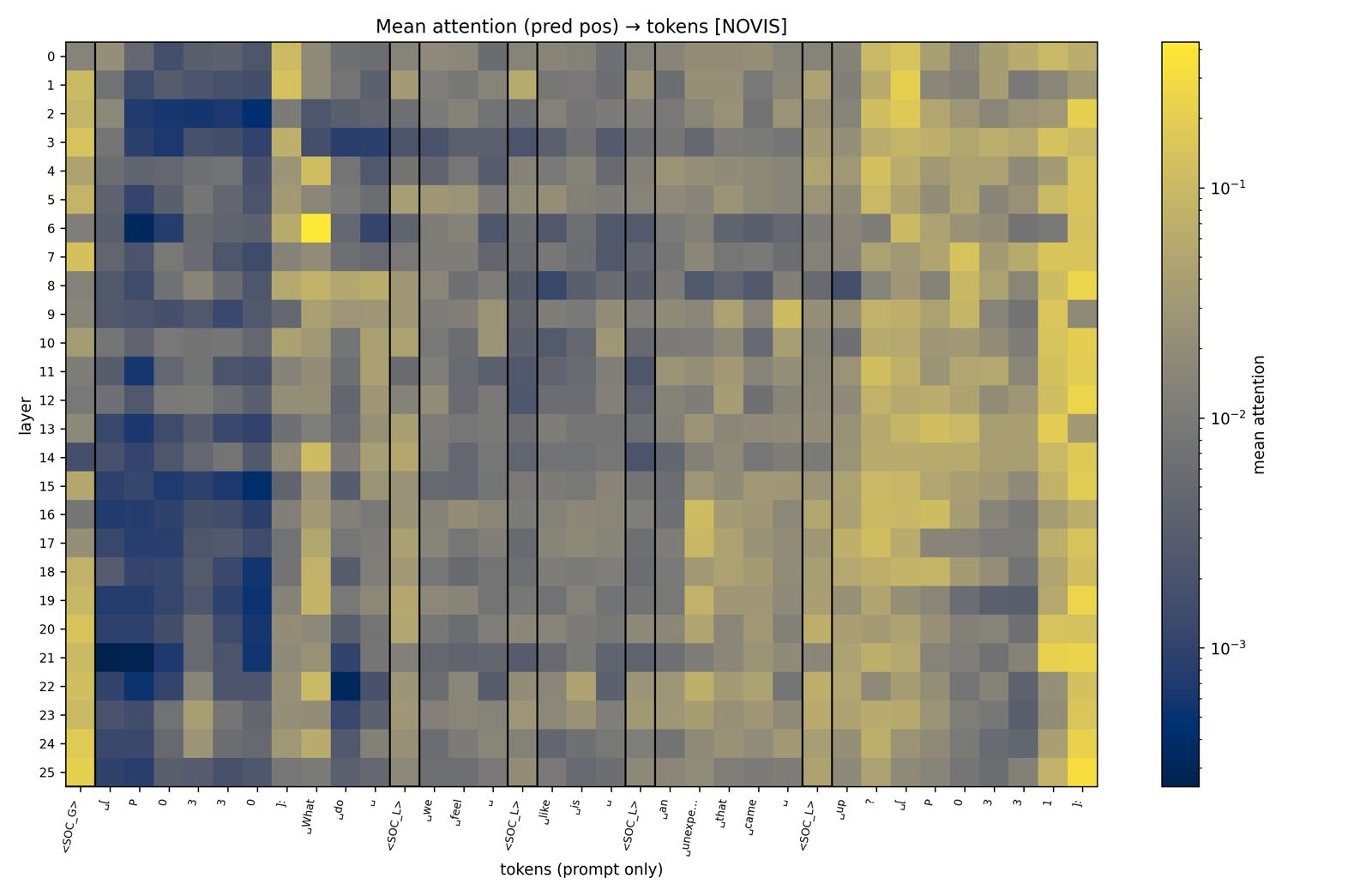 We analyze the attention maps from attention layers to understand how much attention is given to social tokens. On the left, we show the results from a string of tokens while on the right, we include a baseline where social tokens are replaced with zero vectors to understand whether there is a positional bias. We find that global social tokens receive a large amount of attention and this is not due to a positional bias as seen from the right visualization.