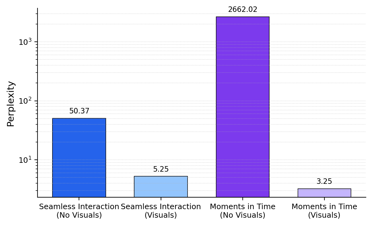 We measure perplexity of generated predictions from Gemma-2, tuned with social tokens and without social tokens. The perplexity is measured on a held-out dialogue set from the Seamless Interaction dataset (left) and a held-out caption set from the odd-one-out task (right). We find that including social tokens leads to a dramatic improvement in the model's ability to predict further social tokens.